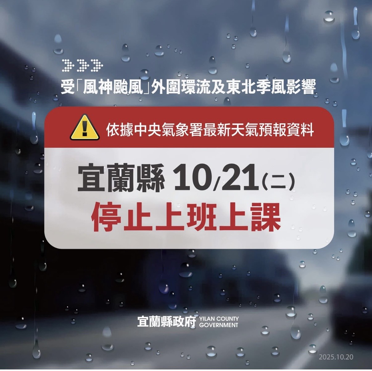 受「風神颱風」影響:10/21(二)停止上班上課
